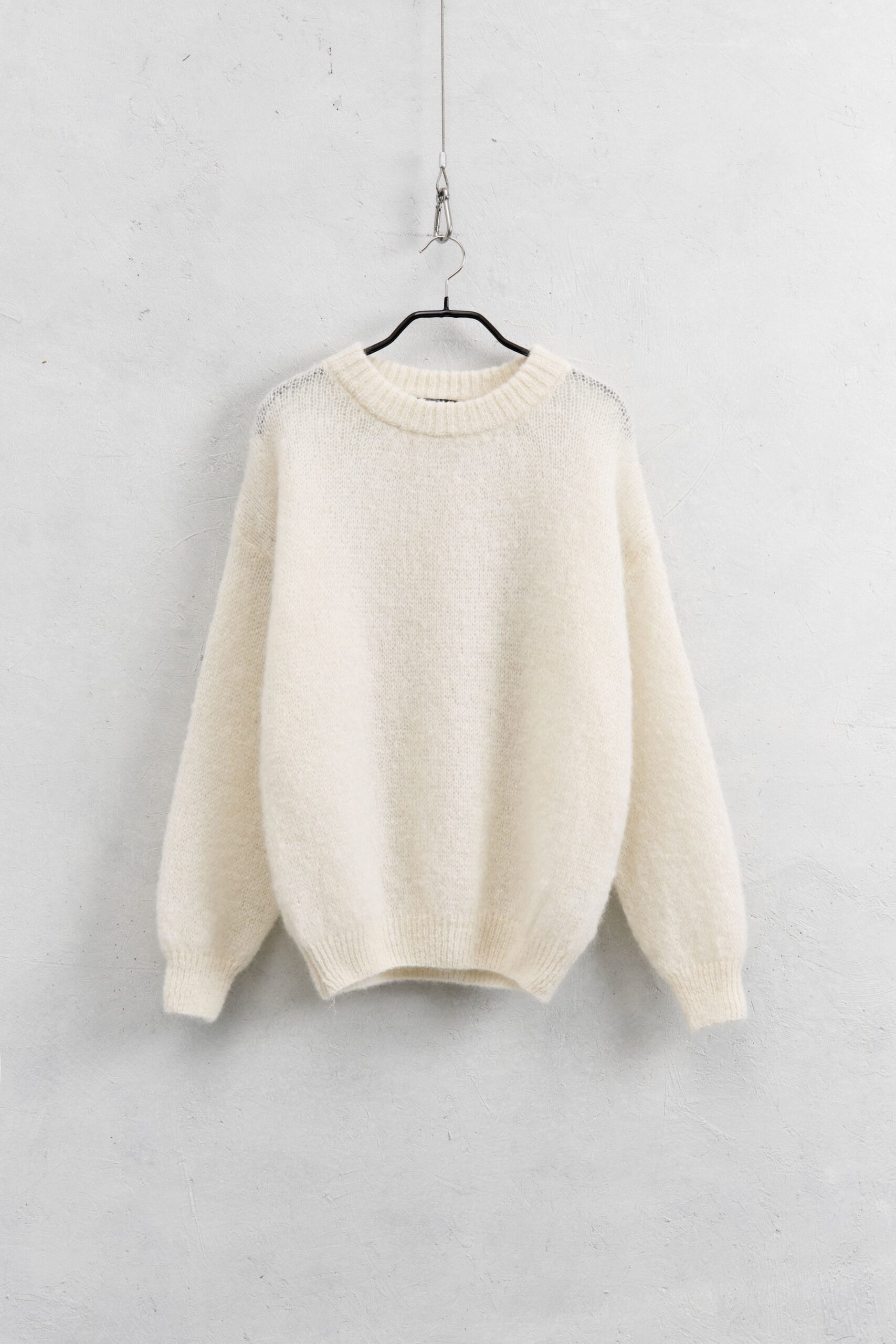 Soft mohair blend sweater. Ribbed crew neck. Long sleeves and soft shoulders. Loose fit, available in ONE size.