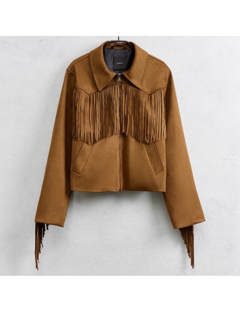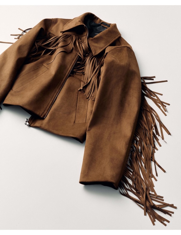 Μπουφάν από συνθετικό καστόρι. Διαθέτει γιακά με πέτο και μπροστινές τσέπες. Λεπτομέρεια με κρόσσια μπροστά και πίσω. Κανονική εφαρμογή.