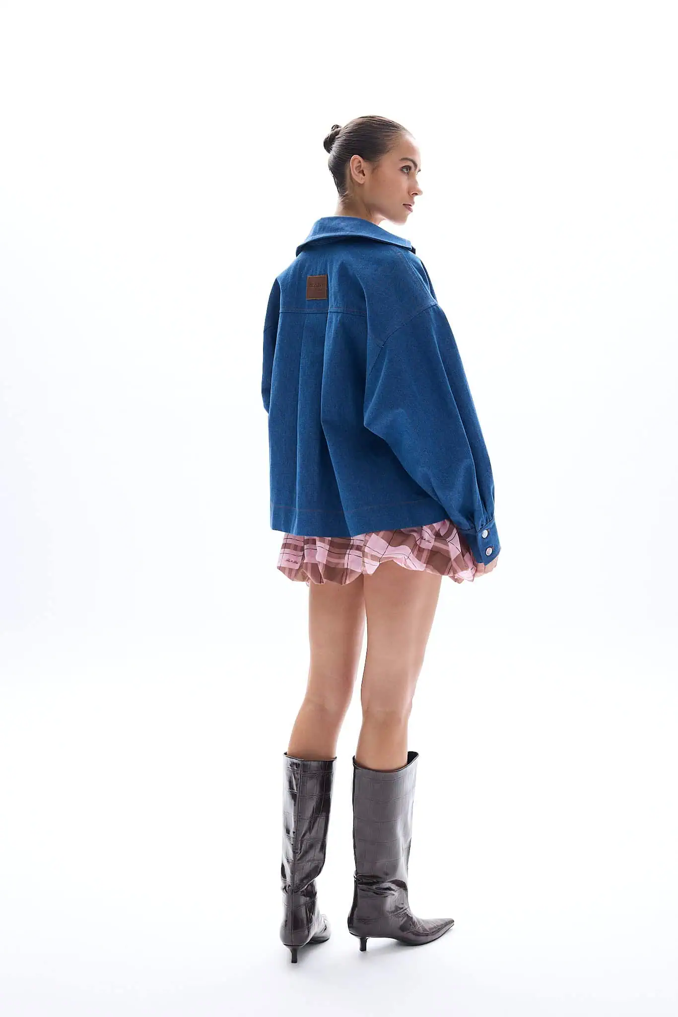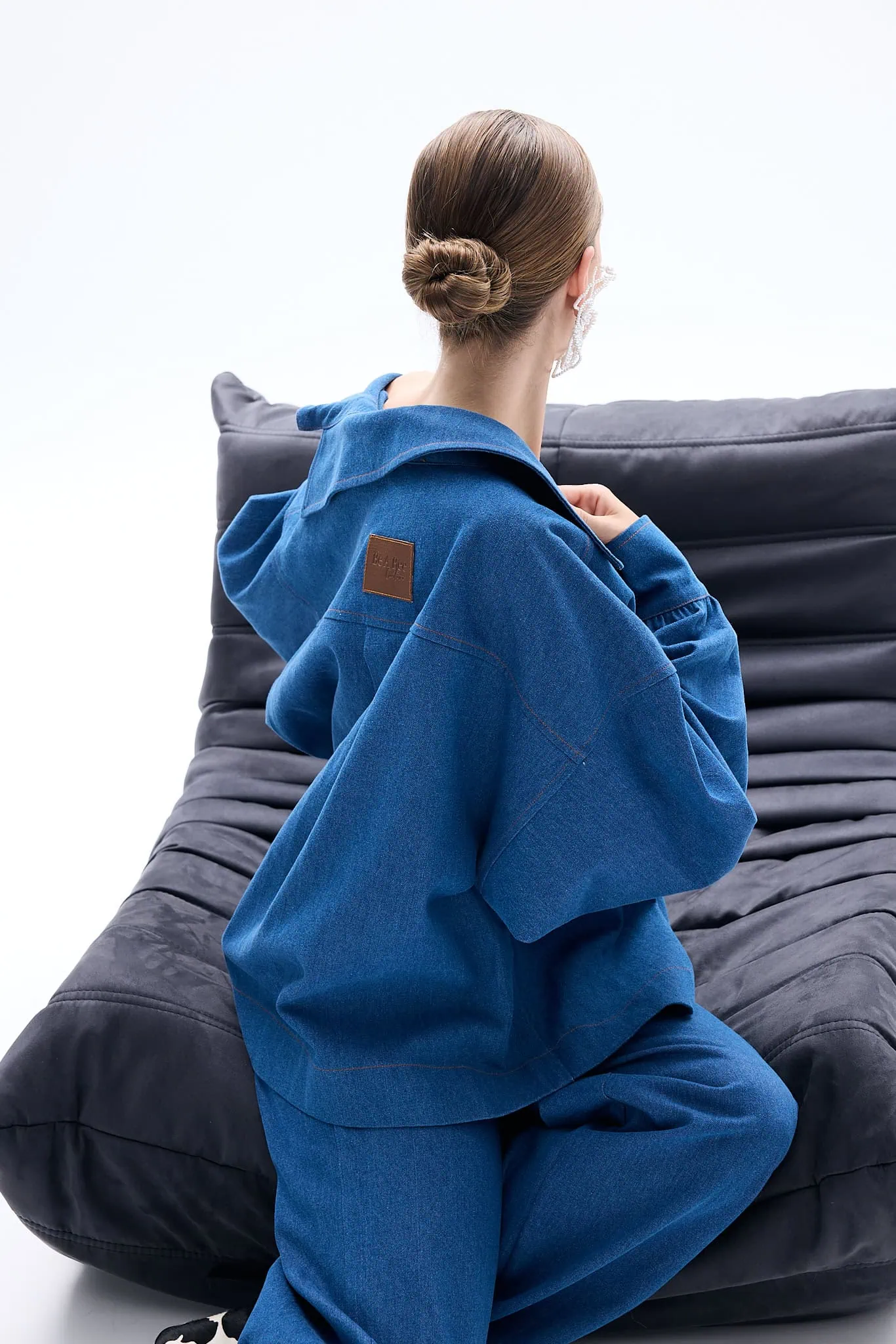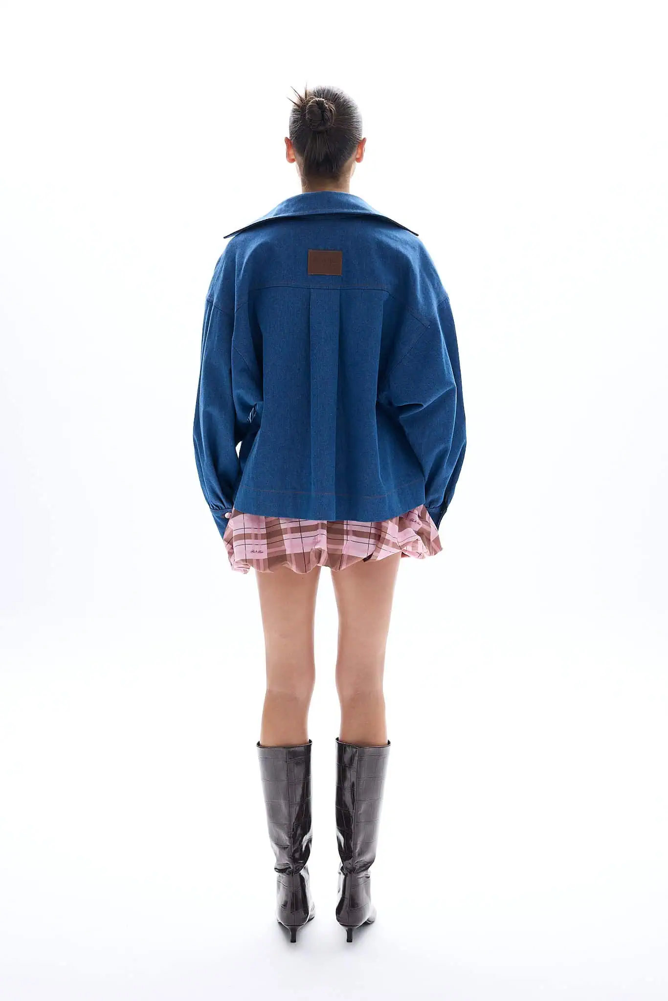 Crafted from 100% cotton, this jacket embraces a relaxed silhouette while maintaining a sharp, structured edge. The oversized cut makes it an adaptable staple, designed to be worn season after season. Finished with the house’s vegan leather logo label, it pairs seamlessly with the Blue Denim Pants and Bustier for a full look or works as a timeless statement on its own.