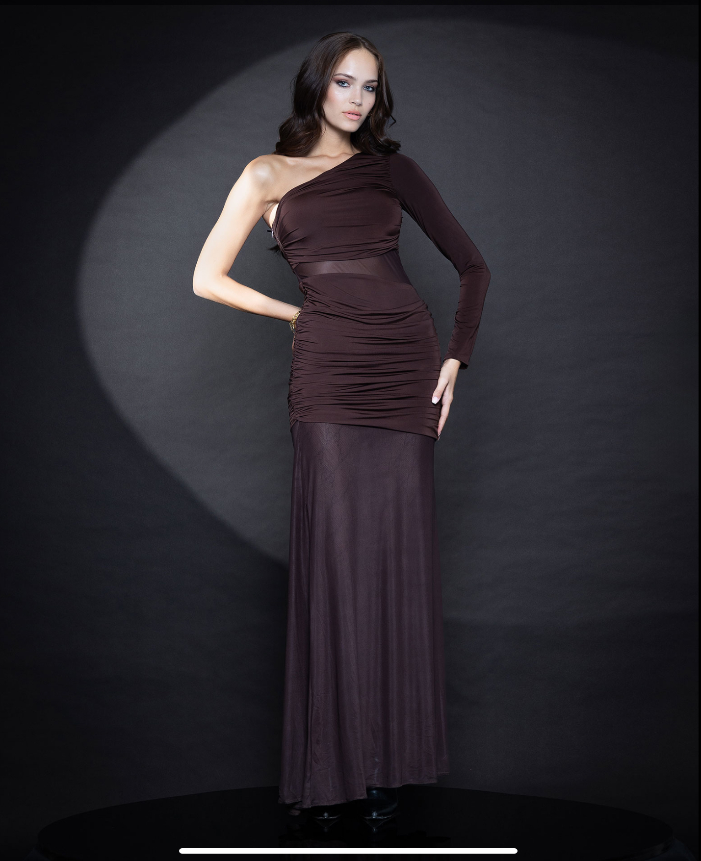 96%PES,4%SP Maxi one shoulder dress made of elasticated fabric with folds and see through detail at the skirt and the waist.