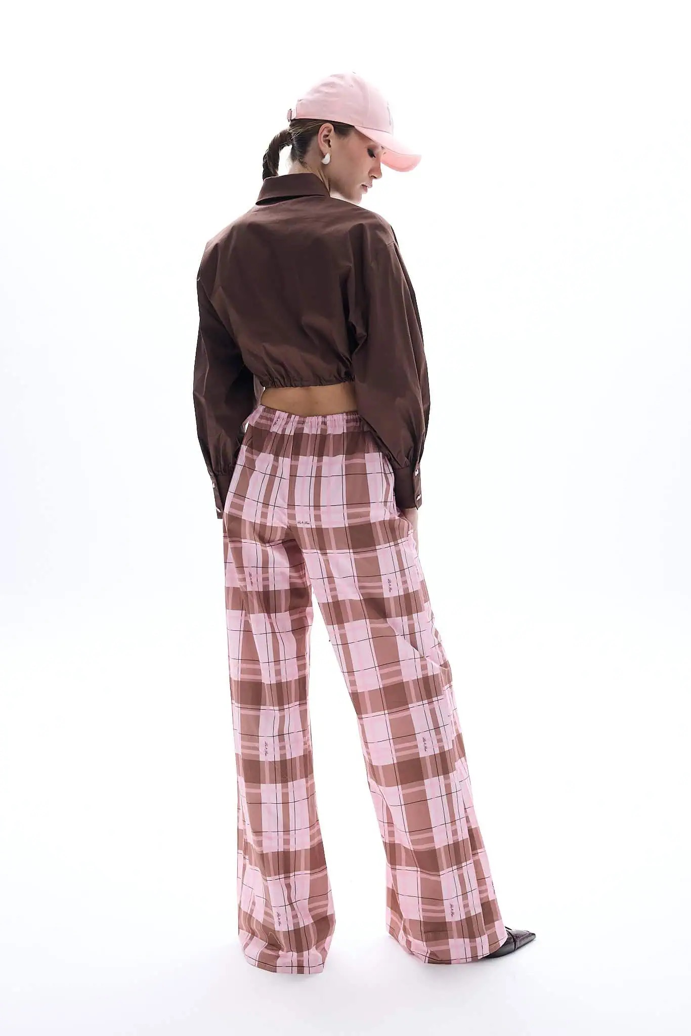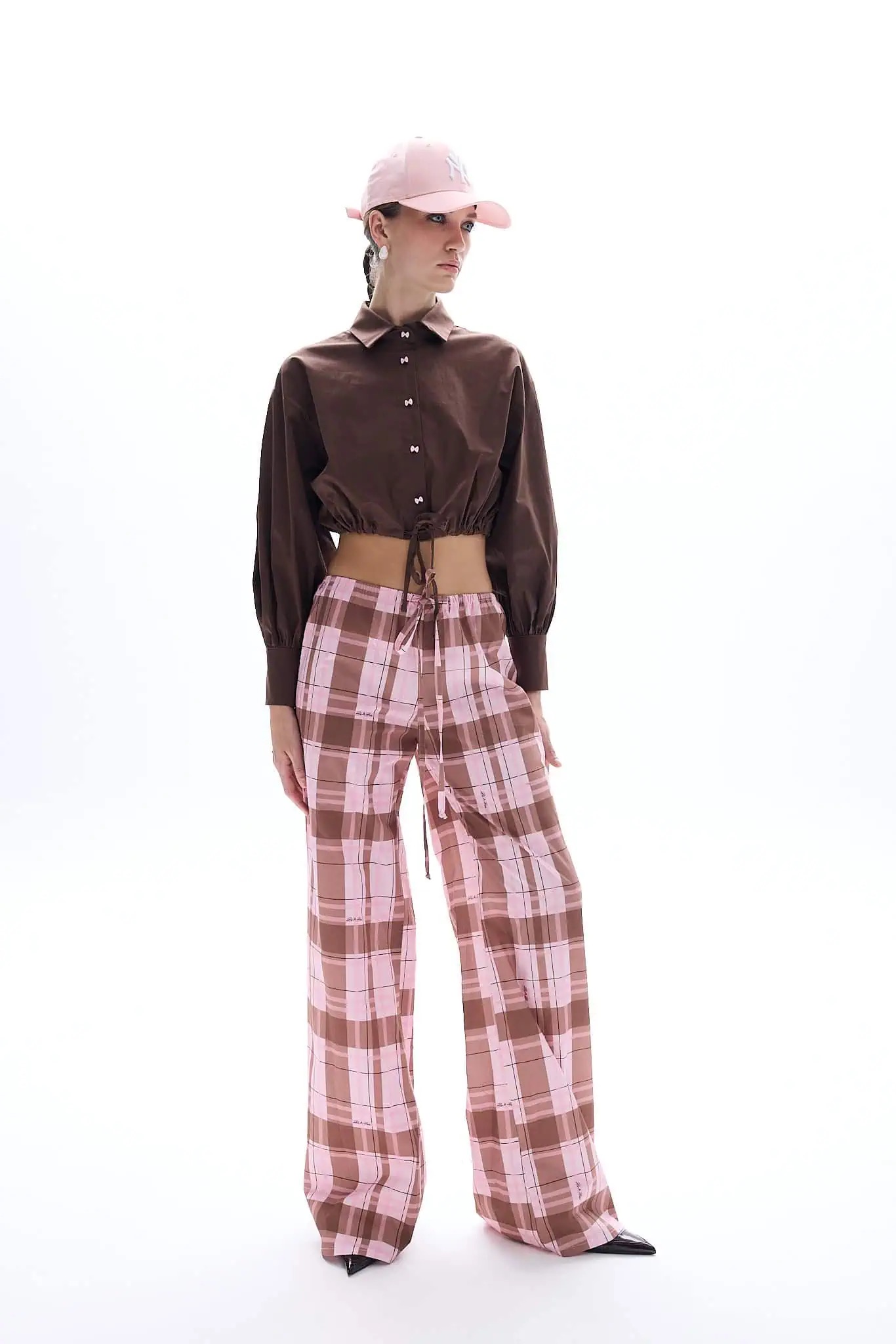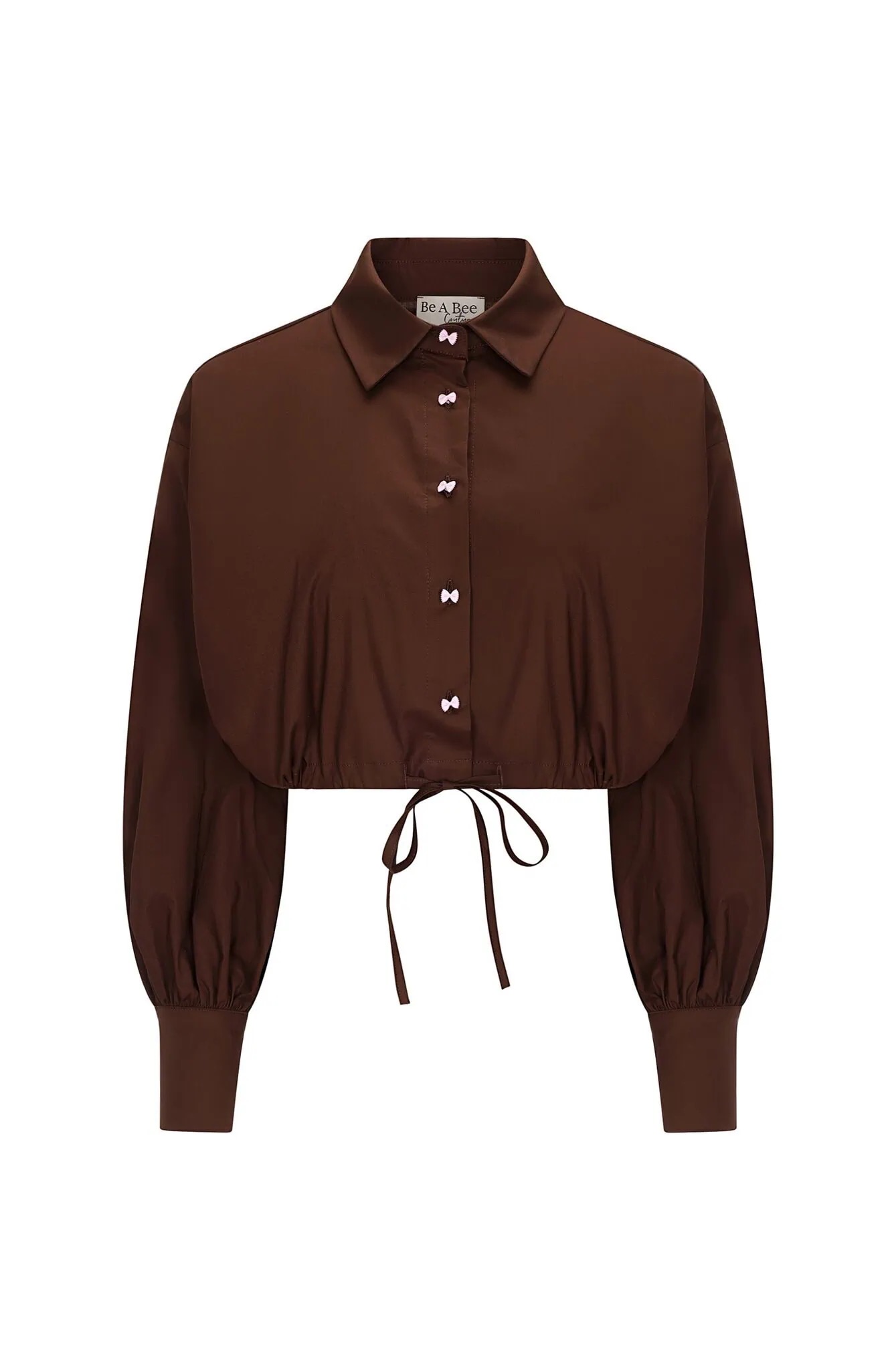 Crafted from pure cotton, the Brown Bow Shirt combines classic shirting with playful elegance. Its cropped shape and drawstring hem create a contemporary silhouette, while the contrast of delicate pink bow-shaped buttons adds a distinctive, feminine touch. A versatile piece that elevates the everyday.
