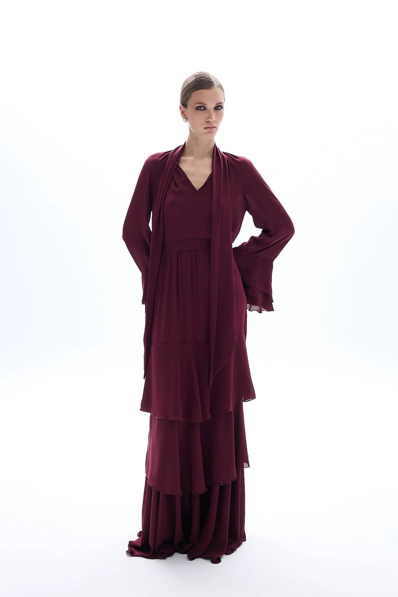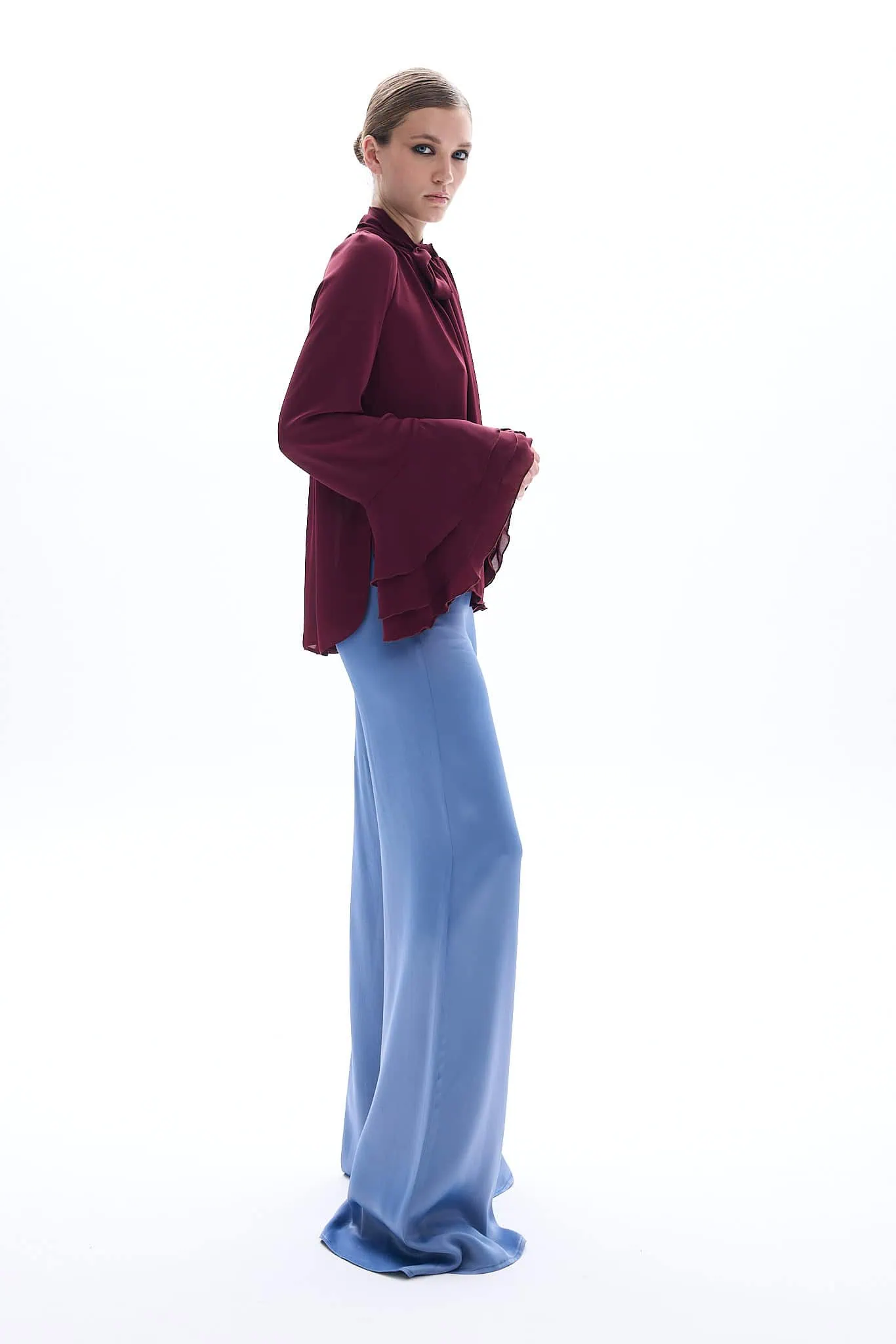 Crafted from 100% recycled polyester, this blouse drapes beautifully in a deep Burgundy tone. Its soft pleated texture and romantic bow neckline bring a sense of refined femininity, while the gently flared sleeves with tiered cuffs add a touch of movement and drama. Designed for effortless wear, the Luella Shirt slips on over the head, combining ease with sophistication. Styled with the matching Luella Skirt or tailored separates, it embodies modern elegance with a conscious approach.