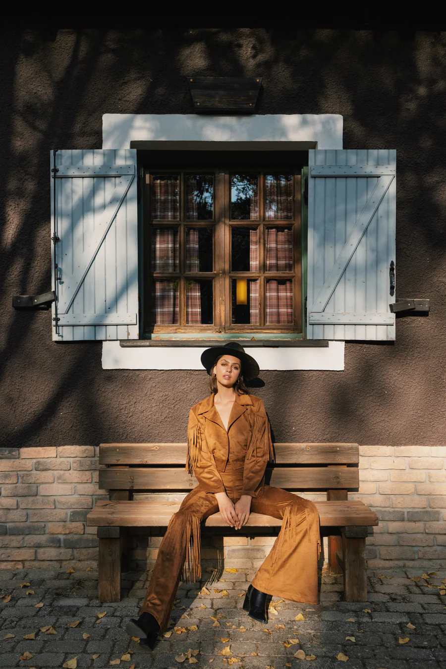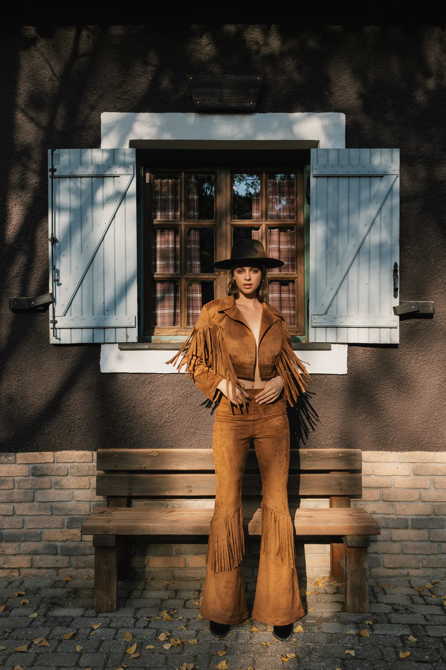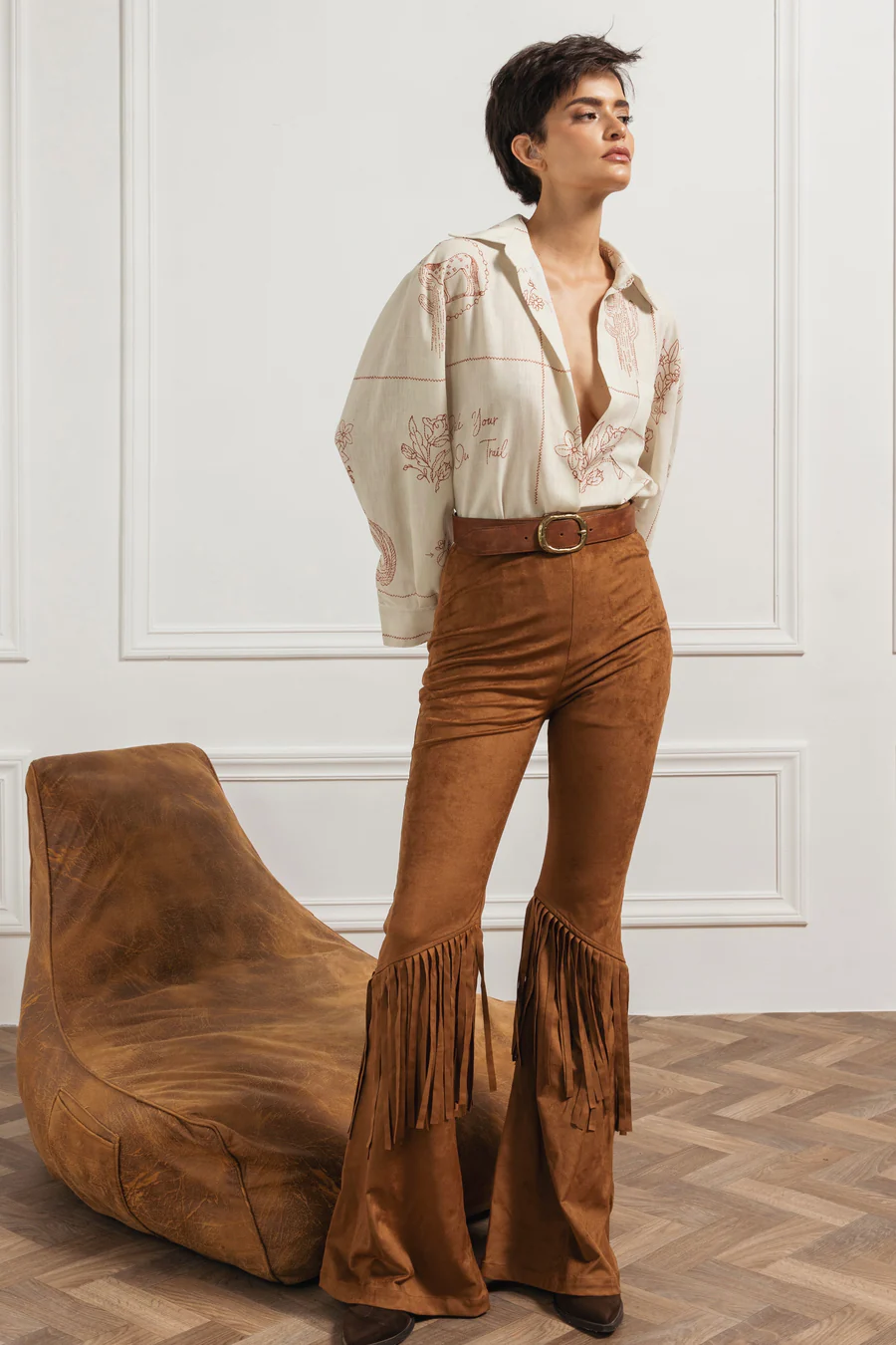 High-waisted cowboy-style Wide relaxed suede pants Fringe detailing 100% PES Made in Greece