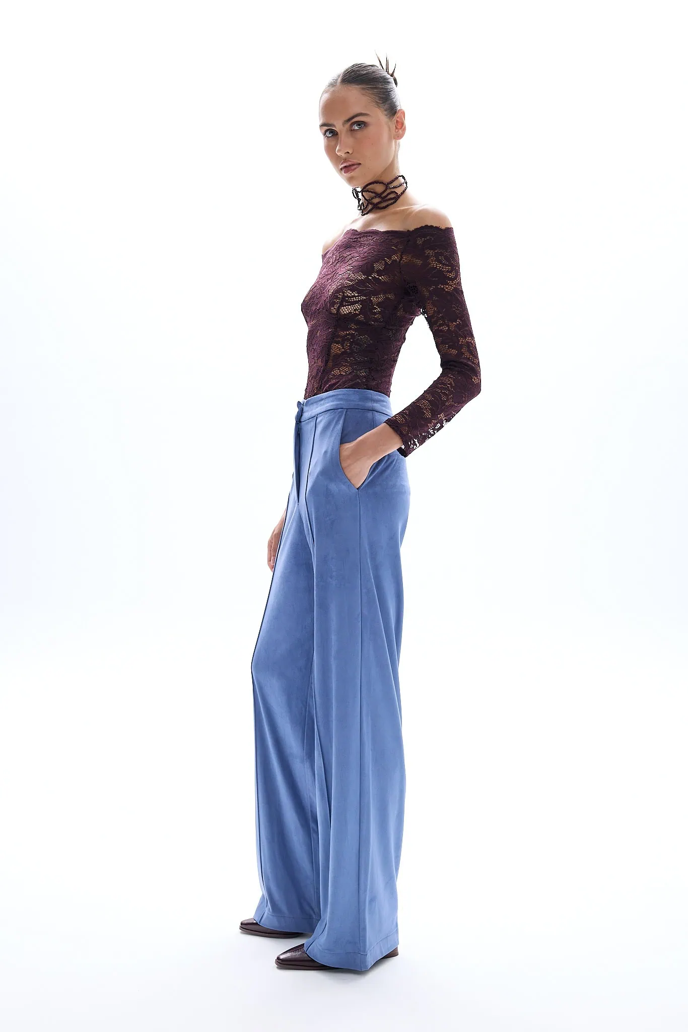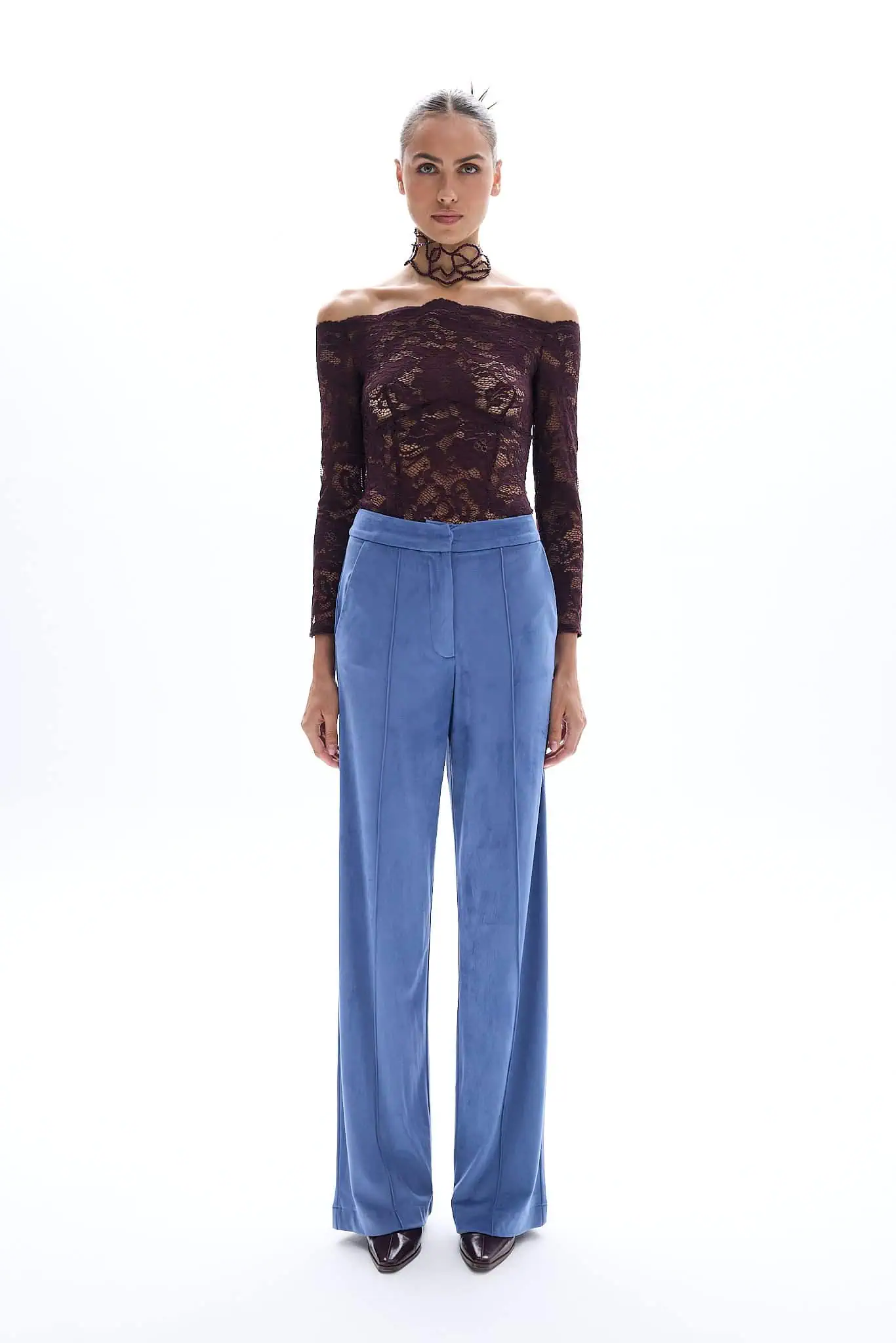 Crafted from a soft, suede-effect fabric, the Odette Suede Brown Pants blend comfort and sophistication. Designed with a high-rise waist and elegant wide-leg cut, they elongate the silhouette while offering effortless movement. The subtle stretch and matte texture enhance their luxurious feel, making them a versatile staple for both day and night. Pair them with the matching Odette Suede Blue Blazer for a refined statement look that embodies contemporary elegance.