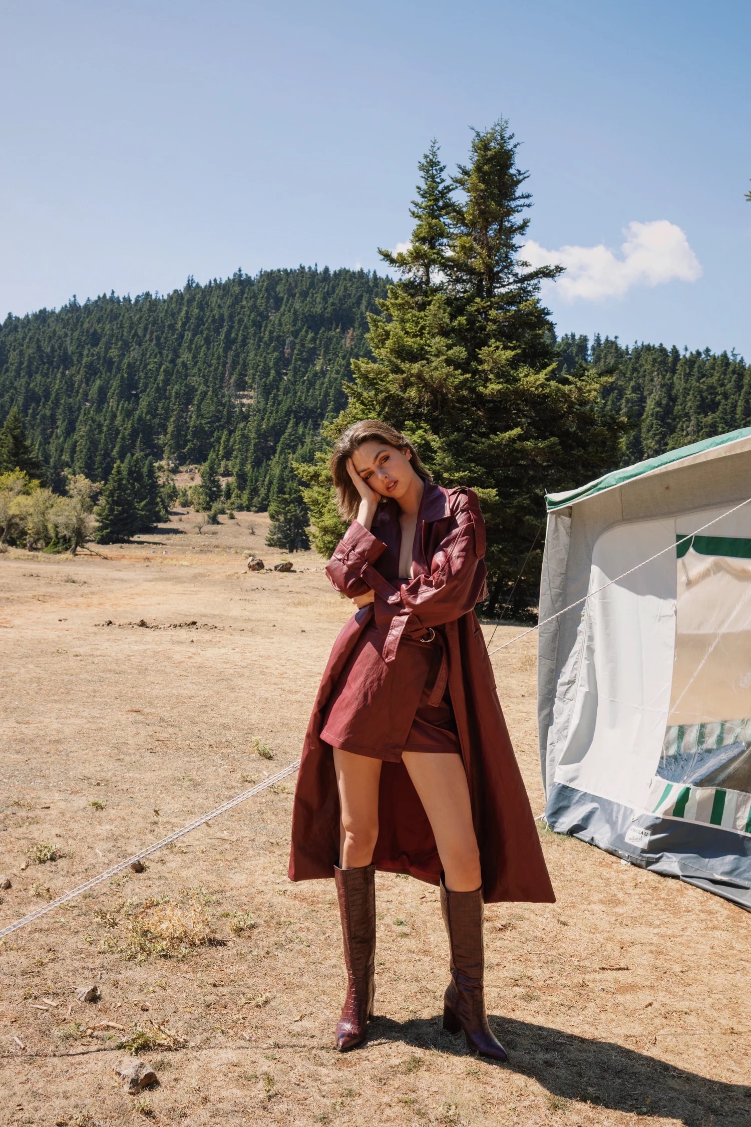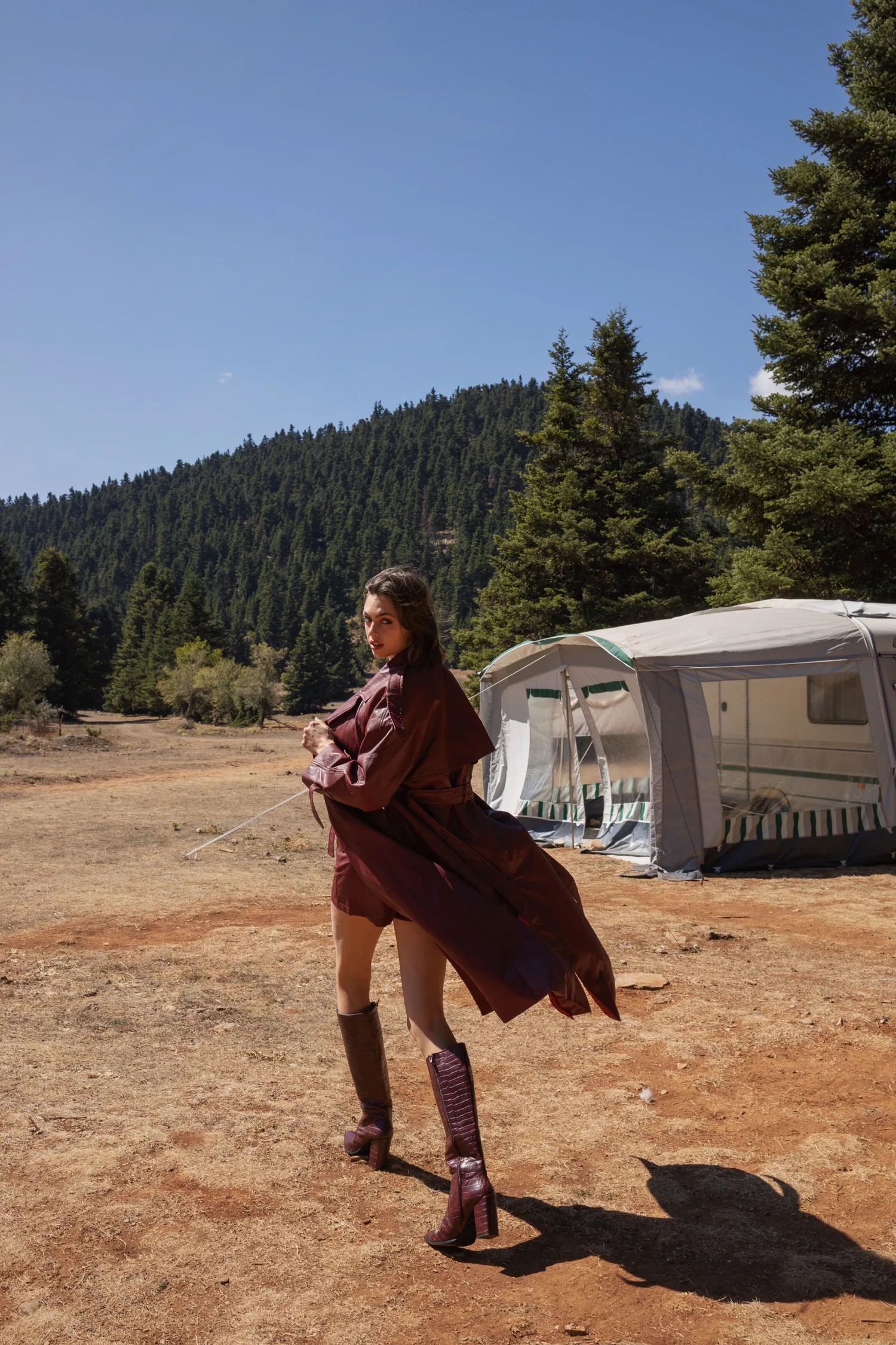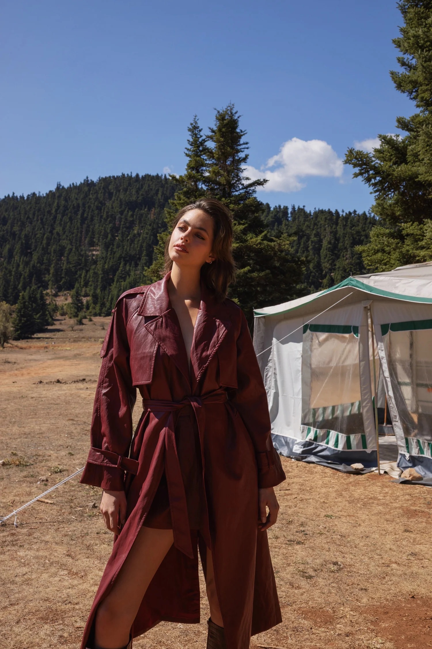 Faux leather long coat Side pockets Waist belt Relaxed fit 100% PES Made in Greece